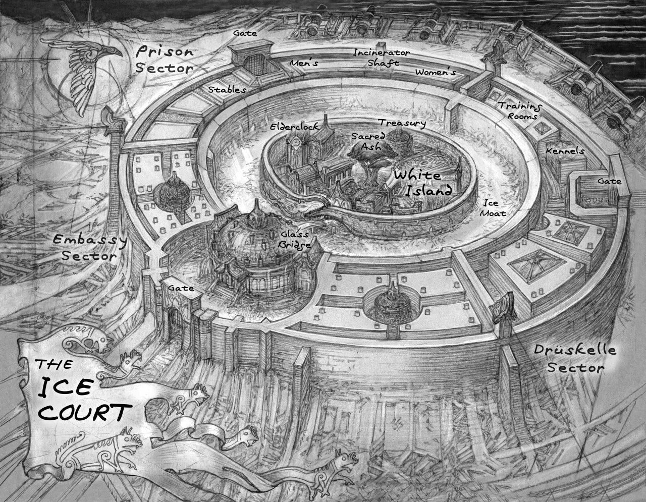 The shore to the ice moat is a slender, slipper rind of white stone. Somewhere along the wall of the drüskelle sector is an etching of a wolf that marks the location of a second glass bridge used to access the White Island by drüskelle initiates.