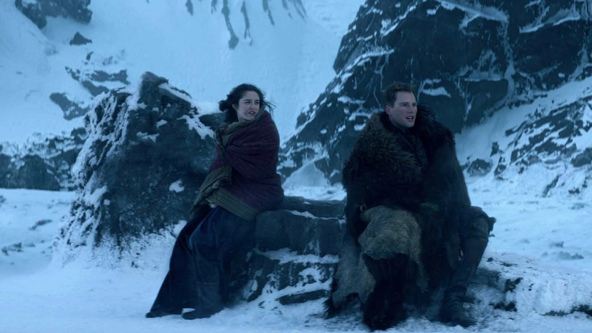 Meanwhile, the storm wrecked the witchhunters' ship, leaving Nina and Matthias clinging to a piece of wood in the violent, freezing sea. In the aftermath, they must work together to stay alive. They reach land, find an abandoned shelter, discuss their respective cultures, and sleep together to keep warm. As they trek through the snow together, Matthias eventually admits he likes Nina, and they both end up laughing and playing around. When Nina unexpectedly almost falls through a crevasse in the ice, Matthias saves her life.